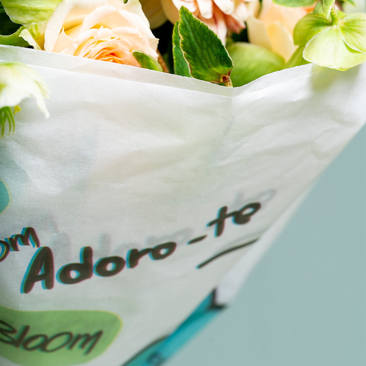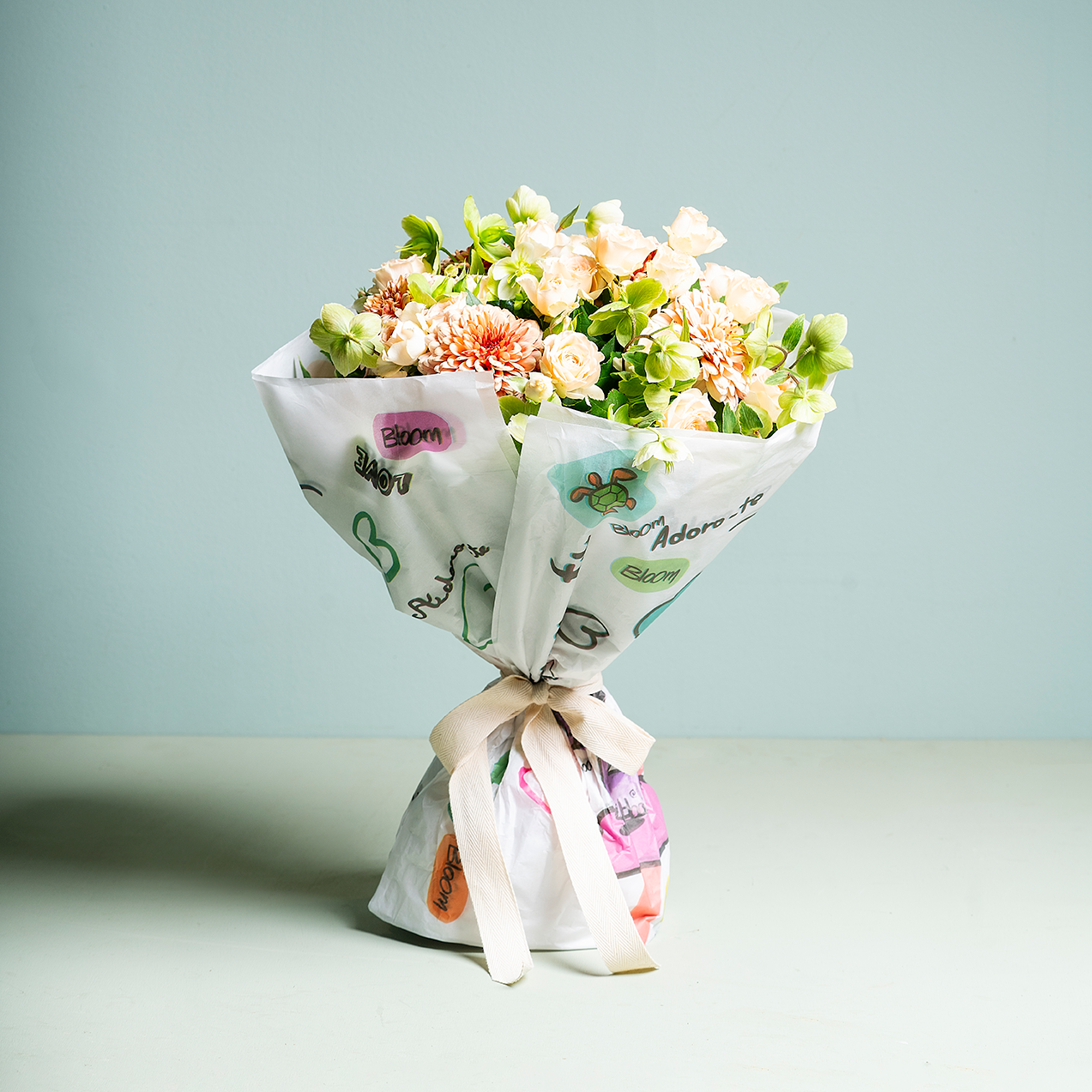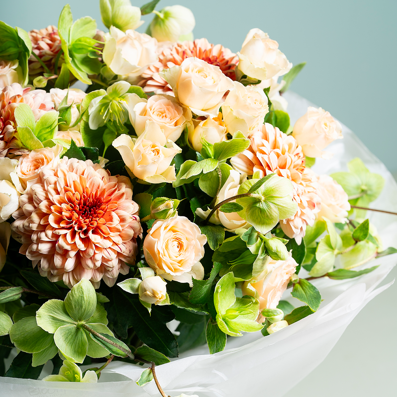 Ramo com Crisântemos, Rosas Santa Teresinha e Helleborus. (Flores sujeitas a disponibilidade em loja.)