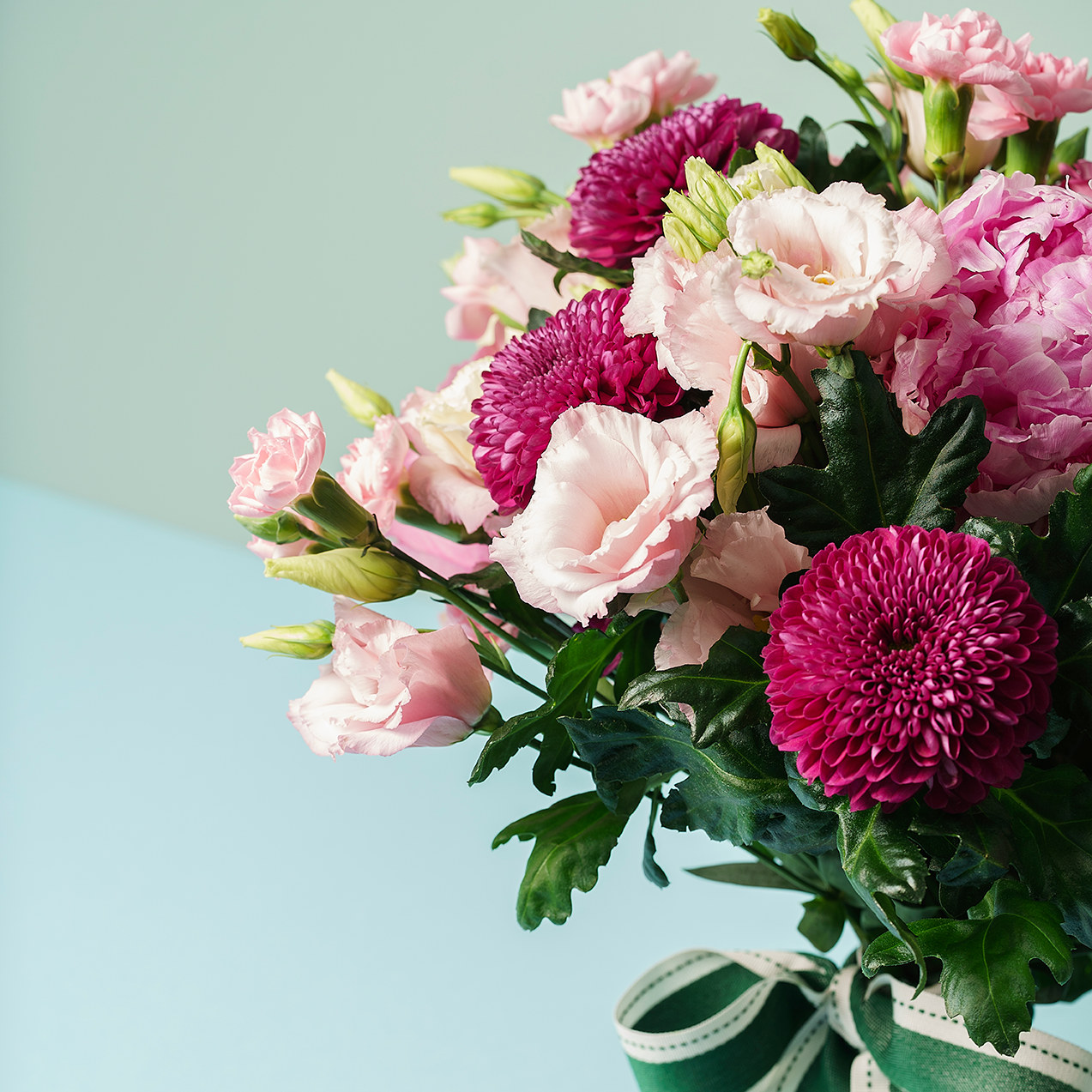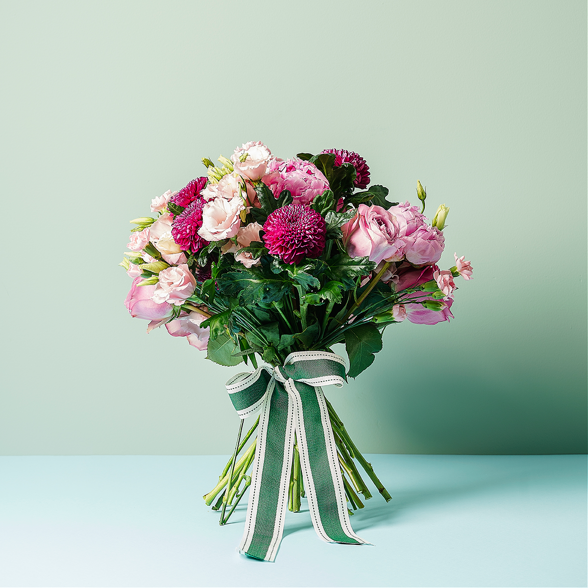 Bouquet com crisântemos, peónias, rosa Queen Crown, cravinas e eustomas cor de rosa.
